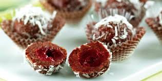 Ingredientes . 200 g de biscoito maisena . 1 xícara (chá) de açúcar de confeiteiro . 1/2 xícara (chá) de chocolate em pó . 1/2 xícara (chá) de coco ralado . 1 colher (sopa) de conhaque . 2 colheres (sopa) de manteiga . 38 cerejas escorridas (reserve a calda) . Coco ralado a gosto para decorar