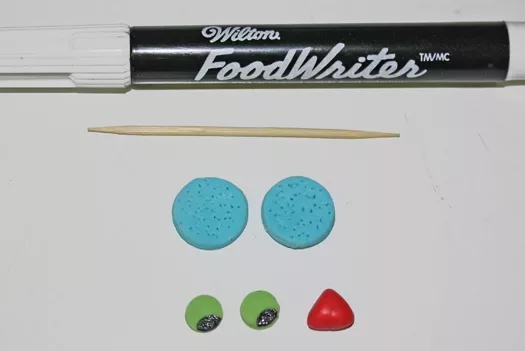 Para os olhos, tomar 2 polvilha confetes em qualquer cor que você quiser (eu escolhi verde) e use seu marcador comestível para desenhar globos oculares.
