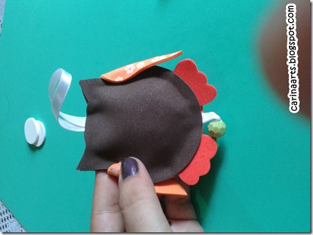 9º - agora, com pedacinhos de EVA, vamos encher a nossa corujinha: